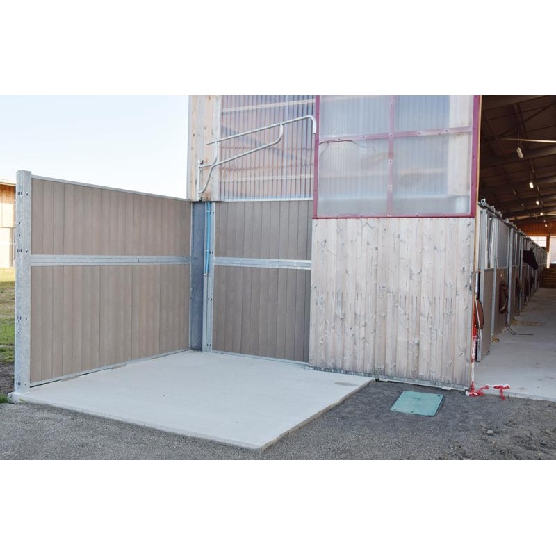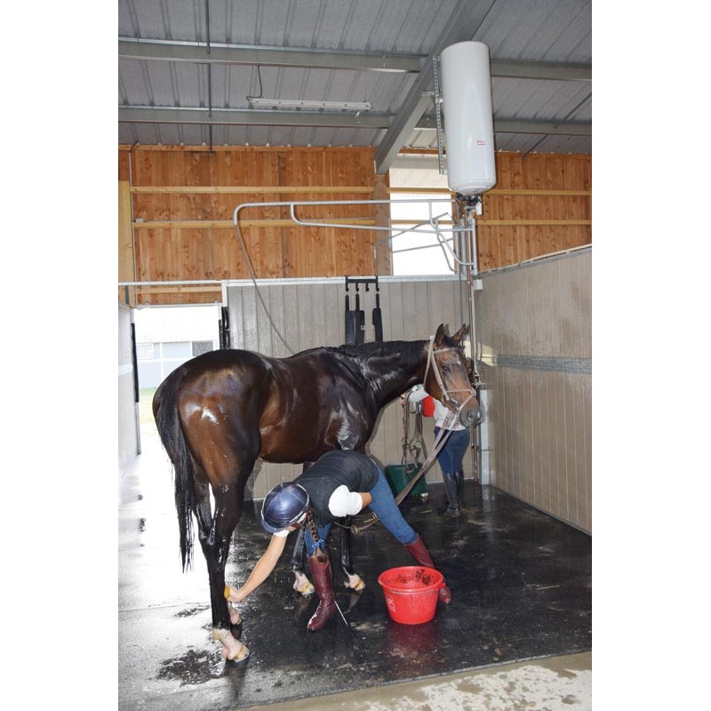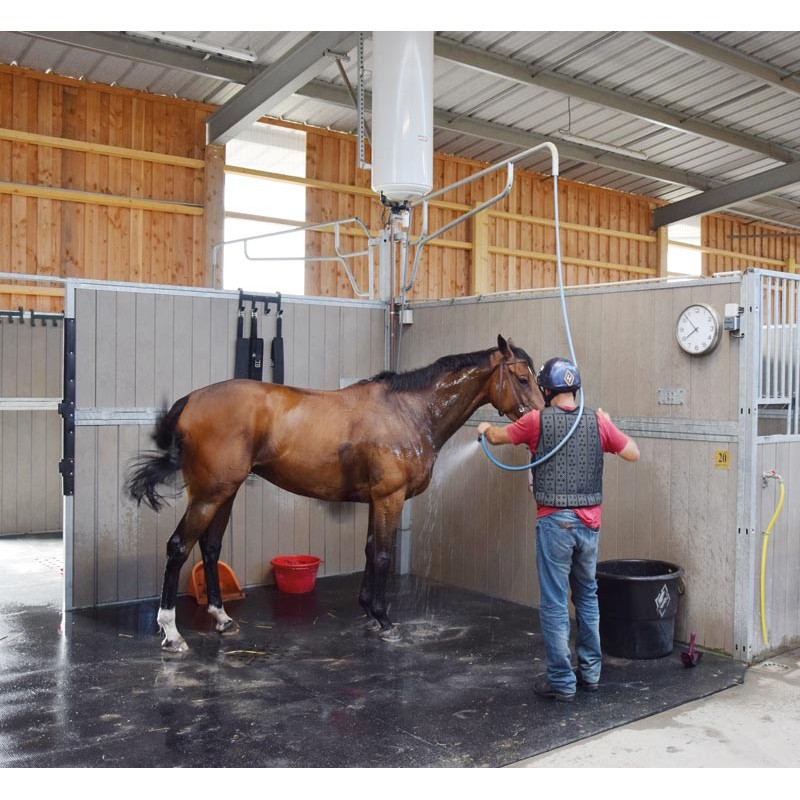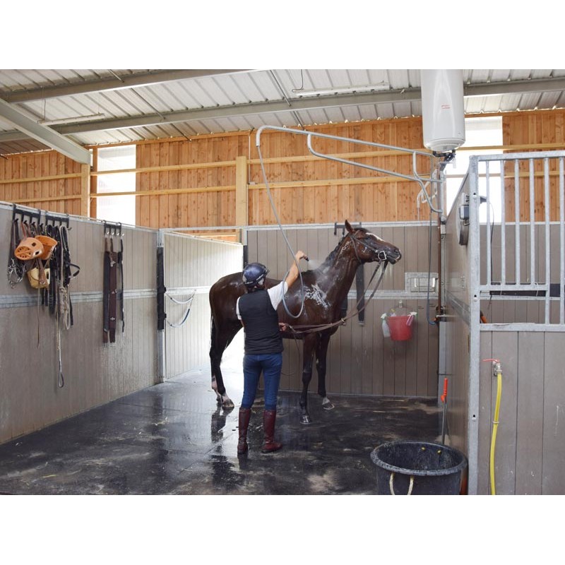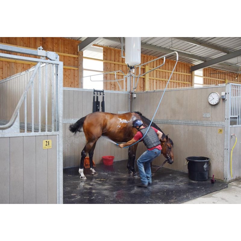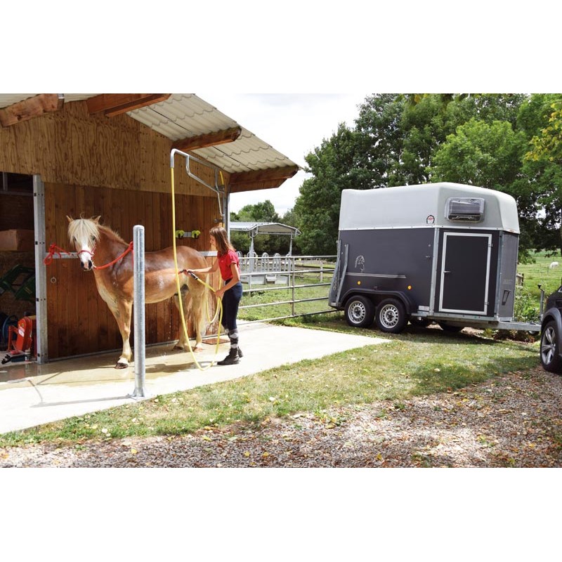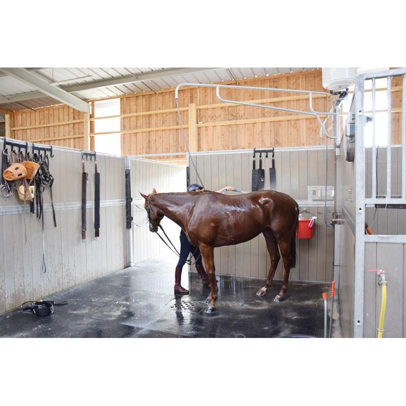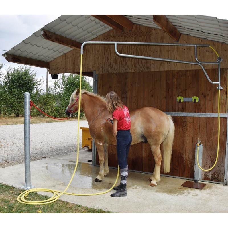 Support de douche pour chevaux. Il permet de surelever et déporter un tuyau d'arrosage dans le tube afin de se déplacer autour du cheval et le nettoyer sans déplacer sans cesse le tuyau. Fixation murale à adapter en hauteur selon la taille des chevaux.