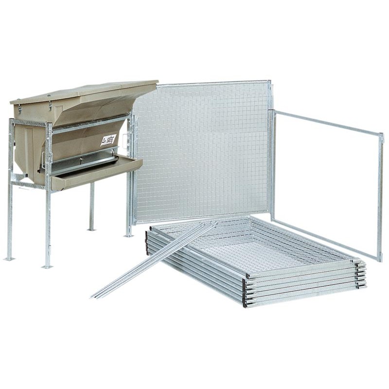 - 2 panneaux grillagés positionnés de chaque côté de la trémie pour éviter la prise d'aliment par la mère. Dims. pour 1 panneau : Long. 1,30 m. - Haut. 1,55 m.