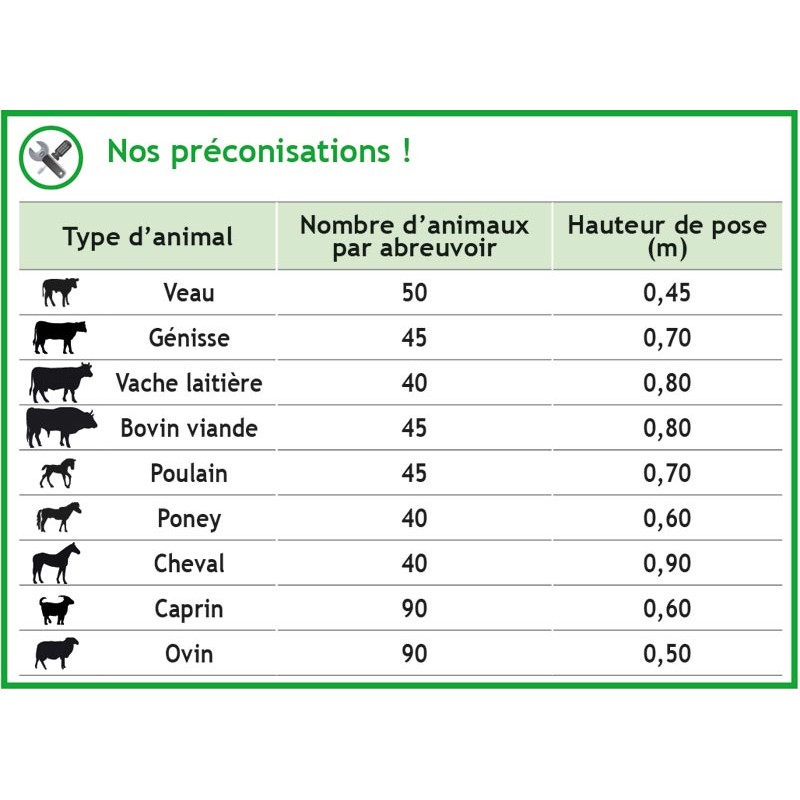 Fabriqués en polyéthylène rotomoulé insensible à la corrosion, ces abreuvoirs de capacité supérieure sont équipés du mécanisme à niveau constant La Gée 32 l/mn en raccord 1/2" et d'un bouchon passe-paroi 33/42 pour un nettoyage et une vidange rapide. Le mécanisme est protégé par un carter en fonte d'aluminium ou d'une tôle inox. Les supports de bacs muraux sont prévus d'origine d'un passage d'arrivée d'eau côté mur. Fonctionne idéalement sur une plage de 3 à 4 bars.
