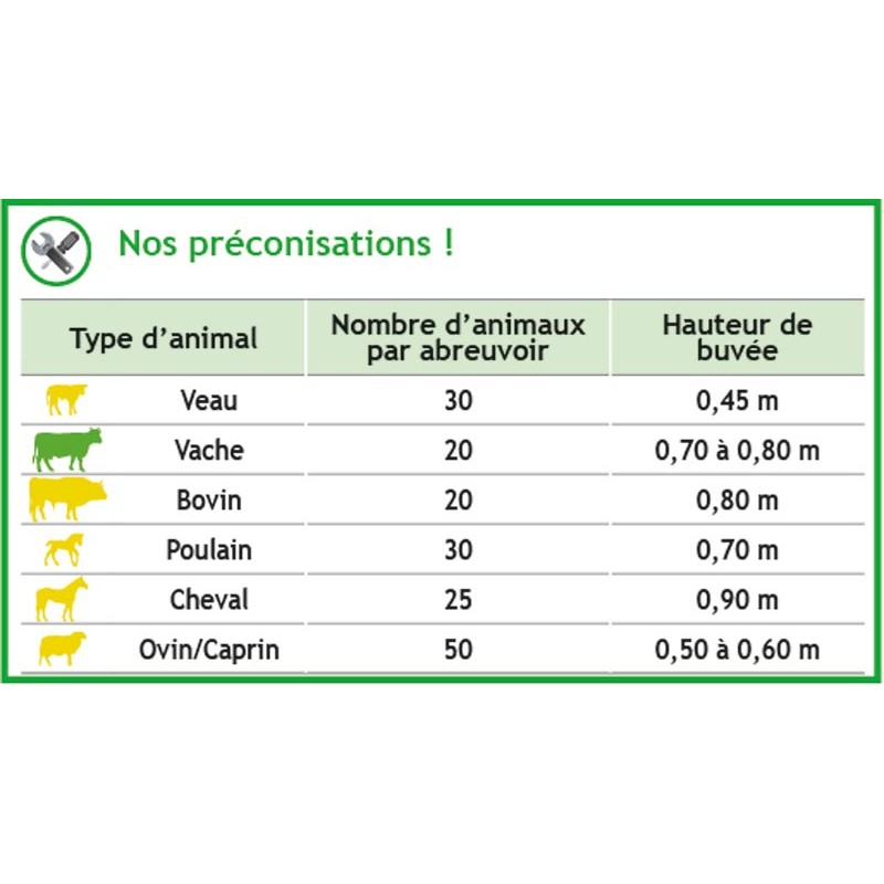 Fabriqués en polyéthylène rotomoulé imputrescible, ces abreuvoirs de grande capacité sont équipés du mécanisme à niveau constant La Gée 32 l/mn et de bouchons passe-paroi 33/42 pour un nettoyage et une vidange rapide. Les supports de bacs en acier galvanisé sont pourvus d'origine d'un passage d'arrivée d'eau côté mur. Fonctionne idéalement sur une plage de pression du réseau de 3 à 4 bars.