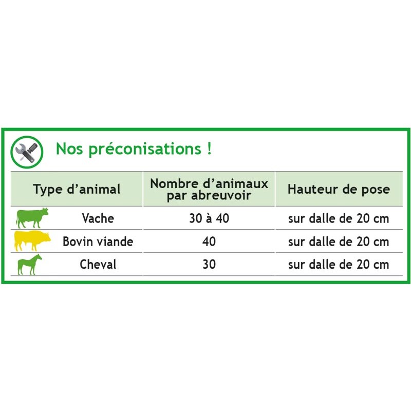 - 1 flotteur 42L/min à corps laiton, raccordement 3/4" situé sous l'abreuvoir,